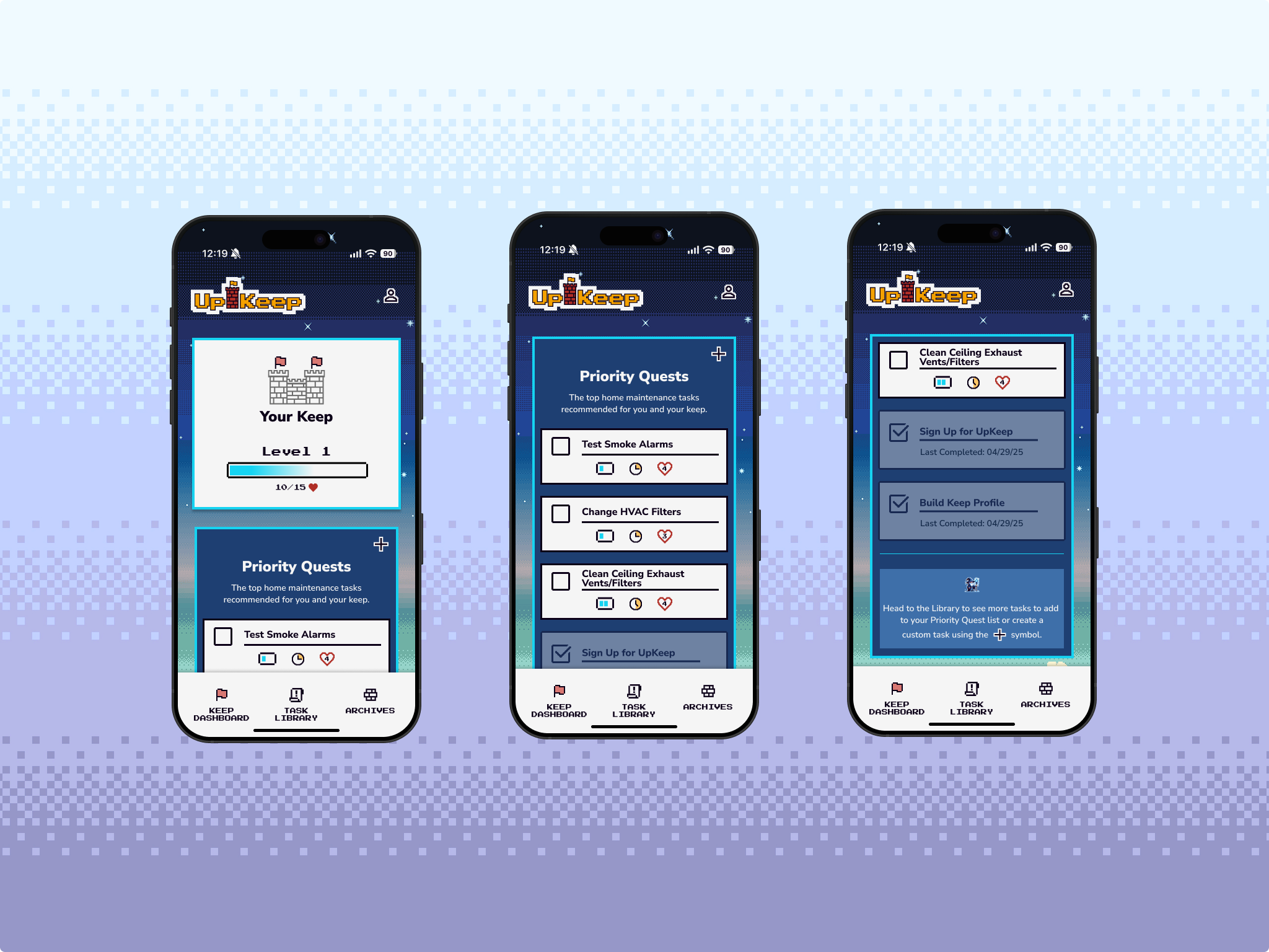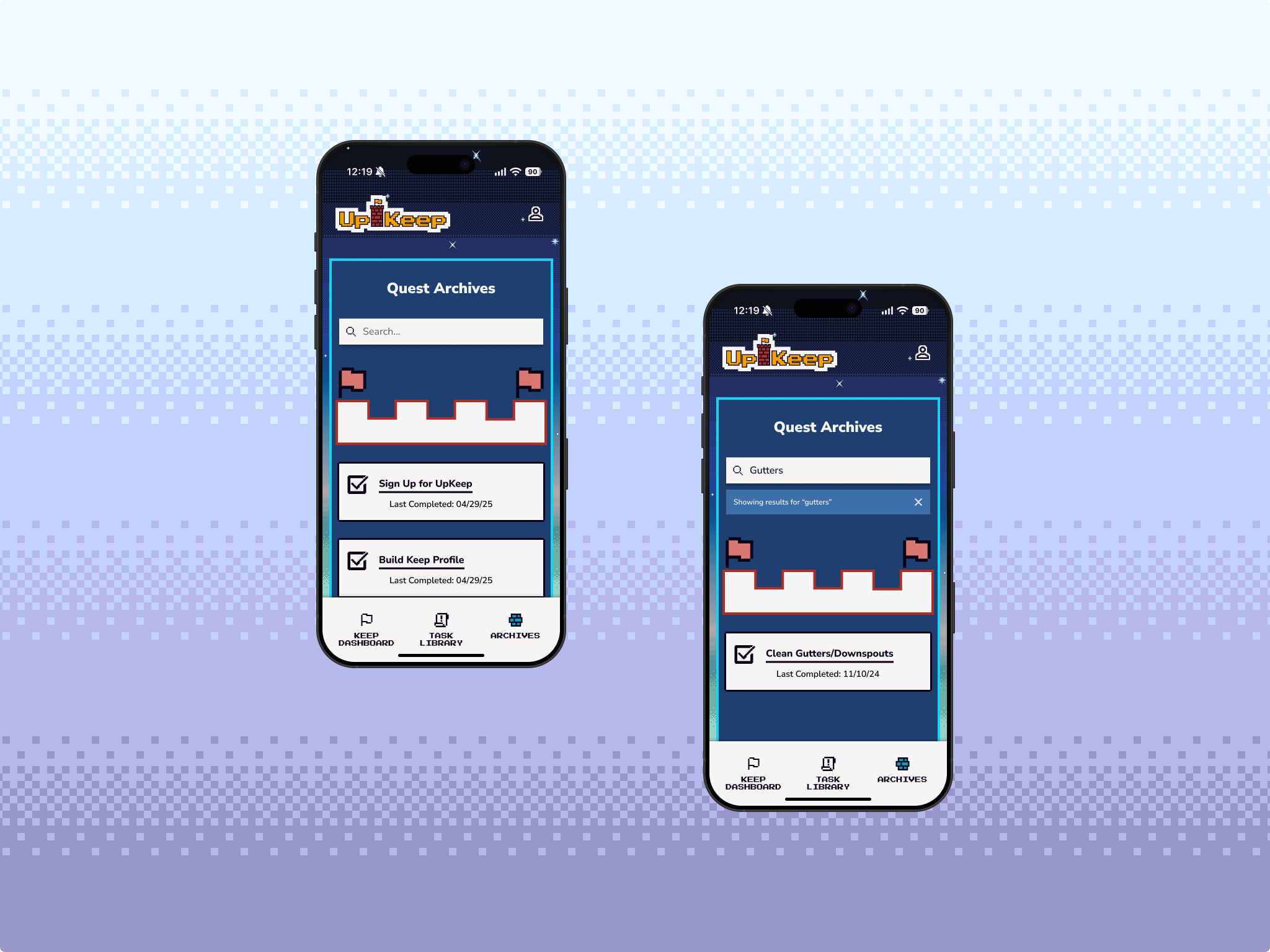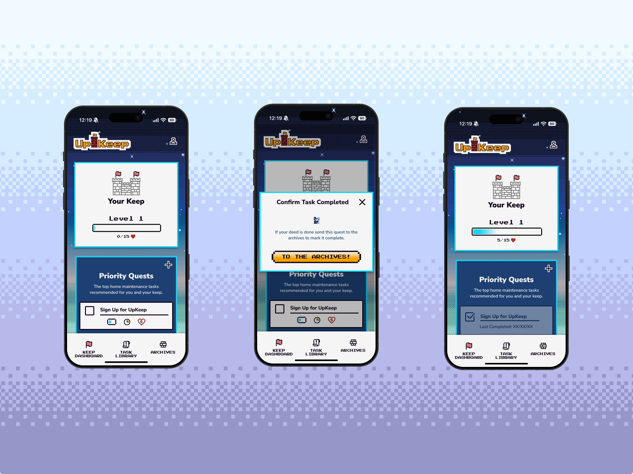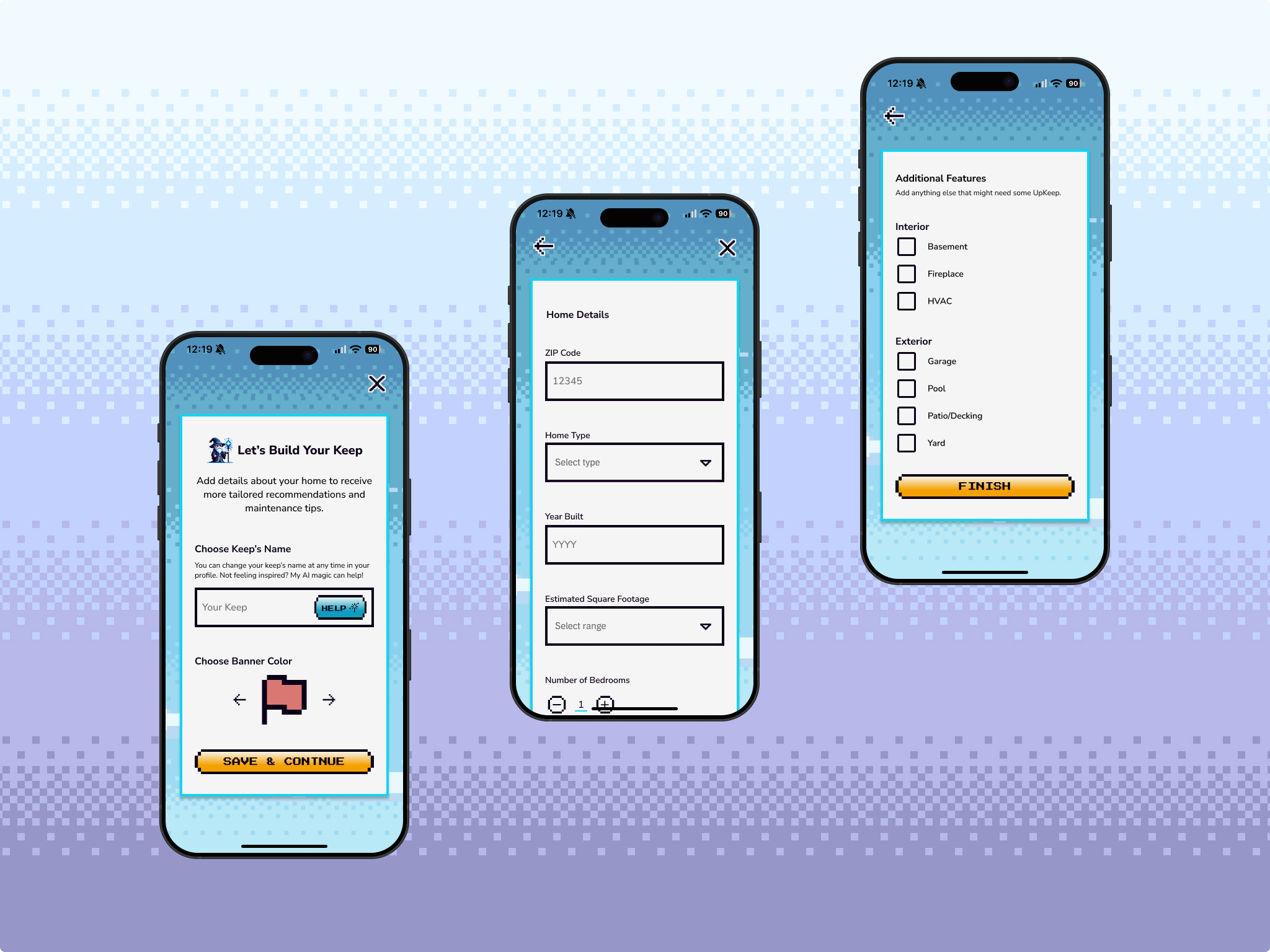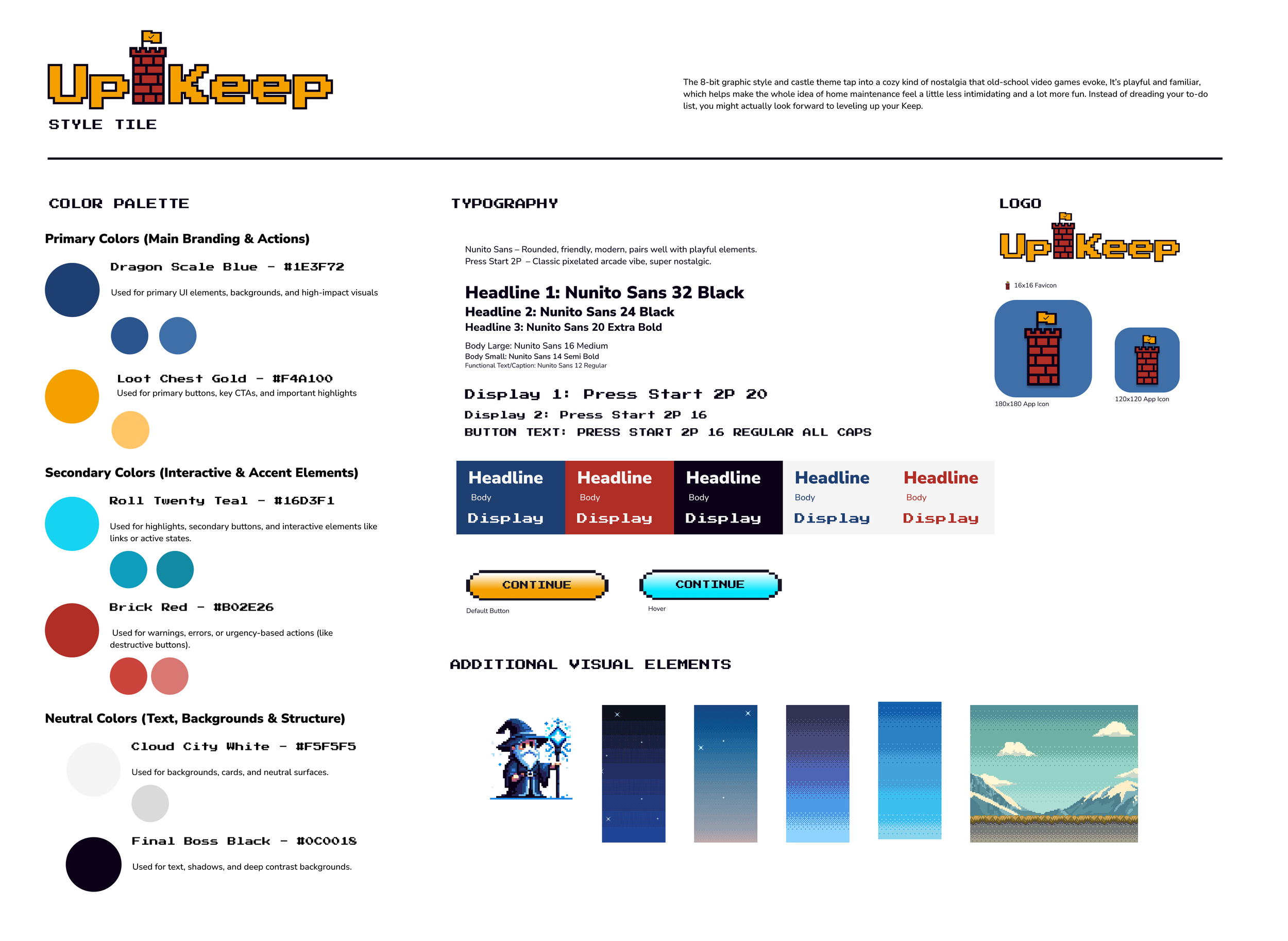 So what’s the deal with the 8-bit castle theme? Designing UpKeep wasn’t just about structure or features, it was also about storytelling. I leaned into my background in advertising and marketing—specifically my experience building brands that feel both strategic and emotionally resonant—in order to make home maintenance feel less like a dreaded chore and more like a fun, achievable quest.