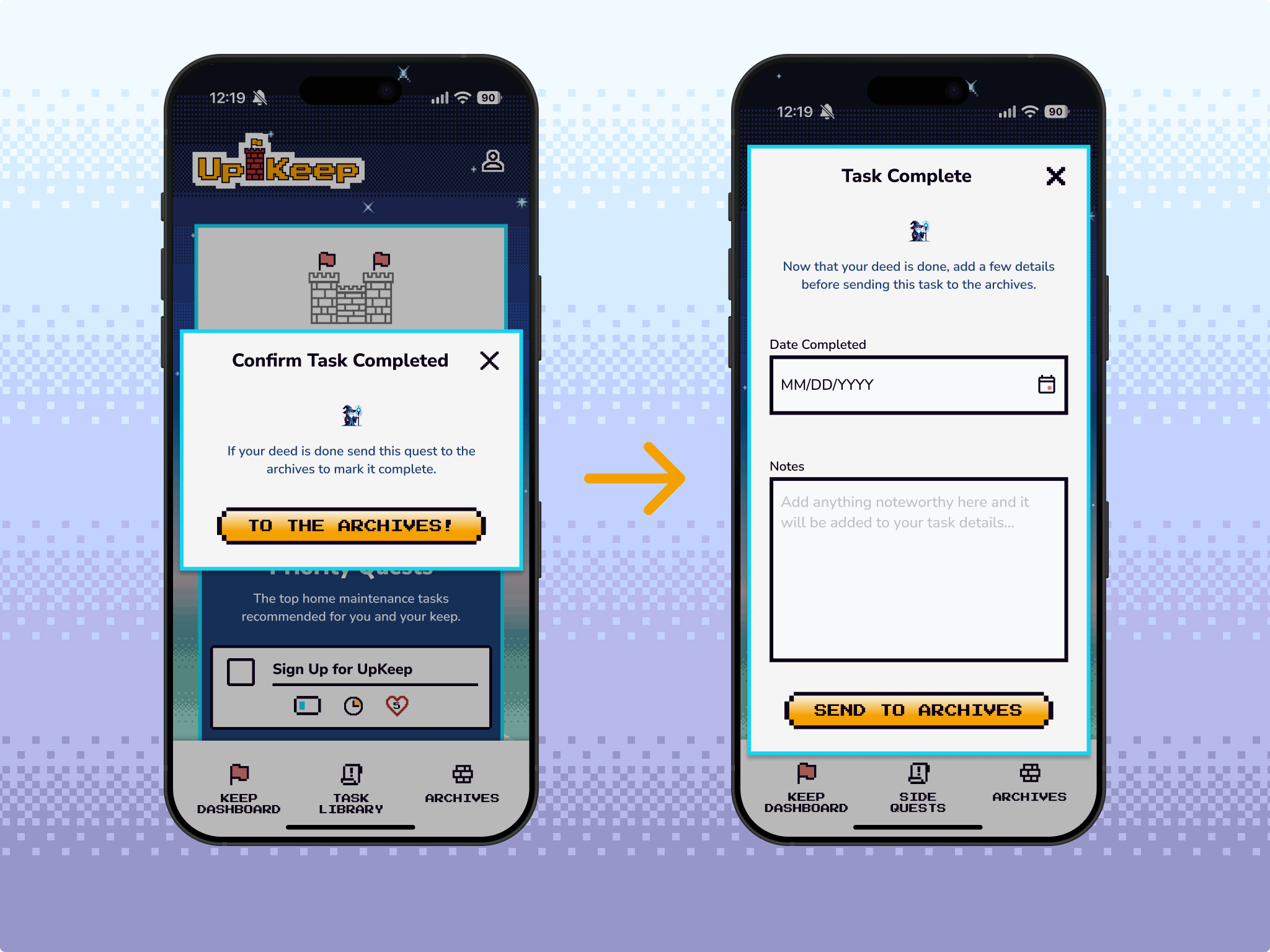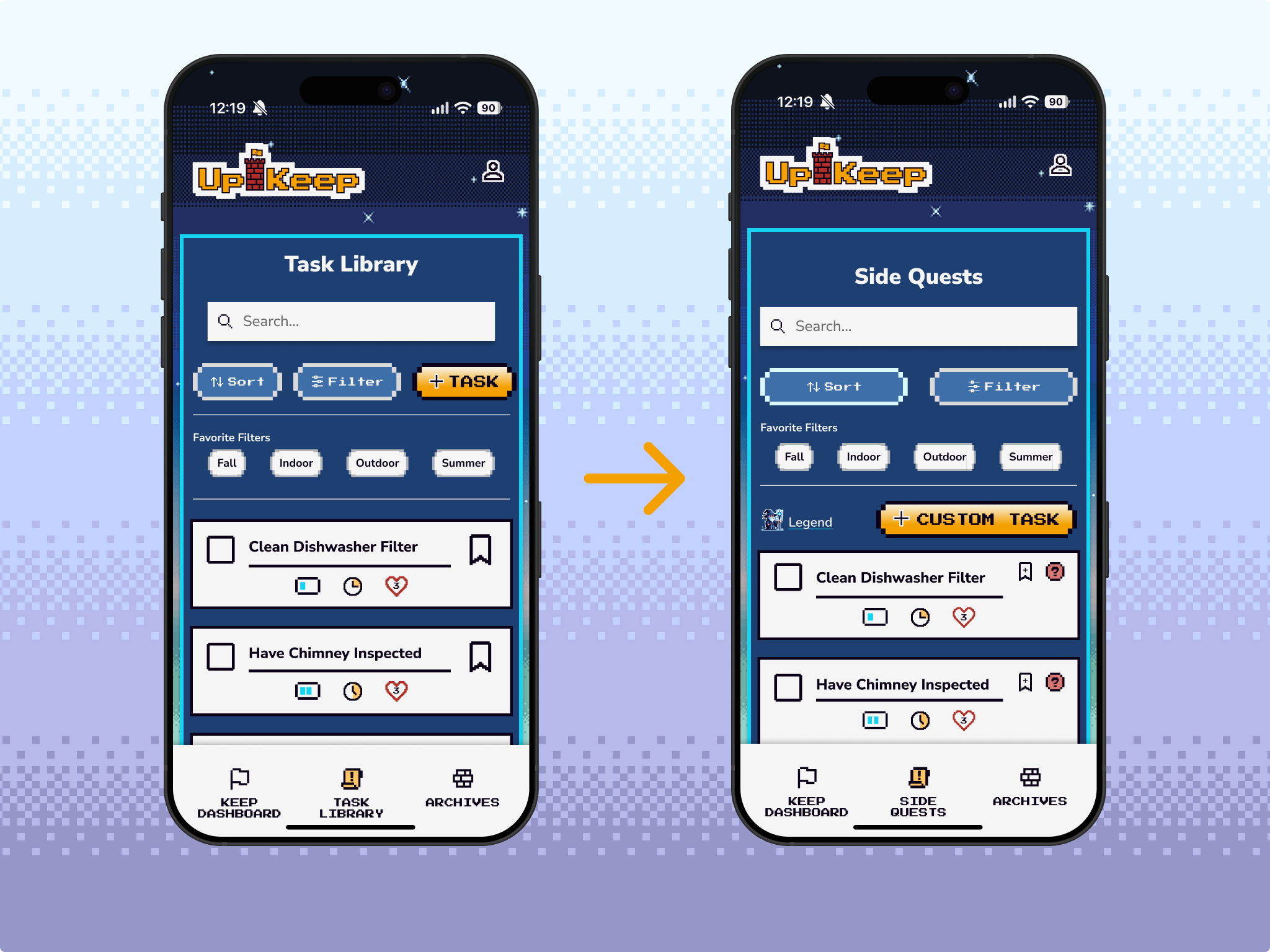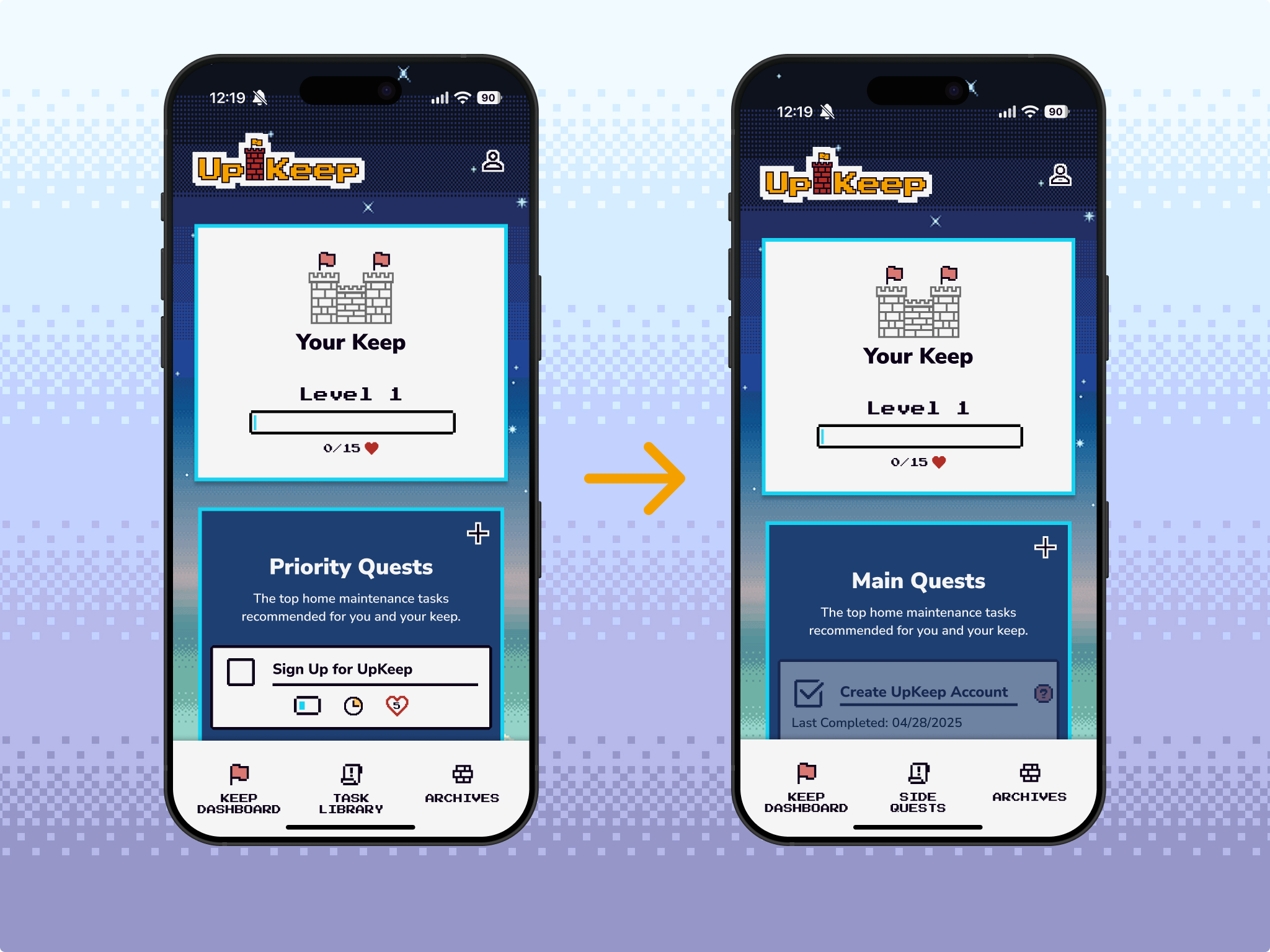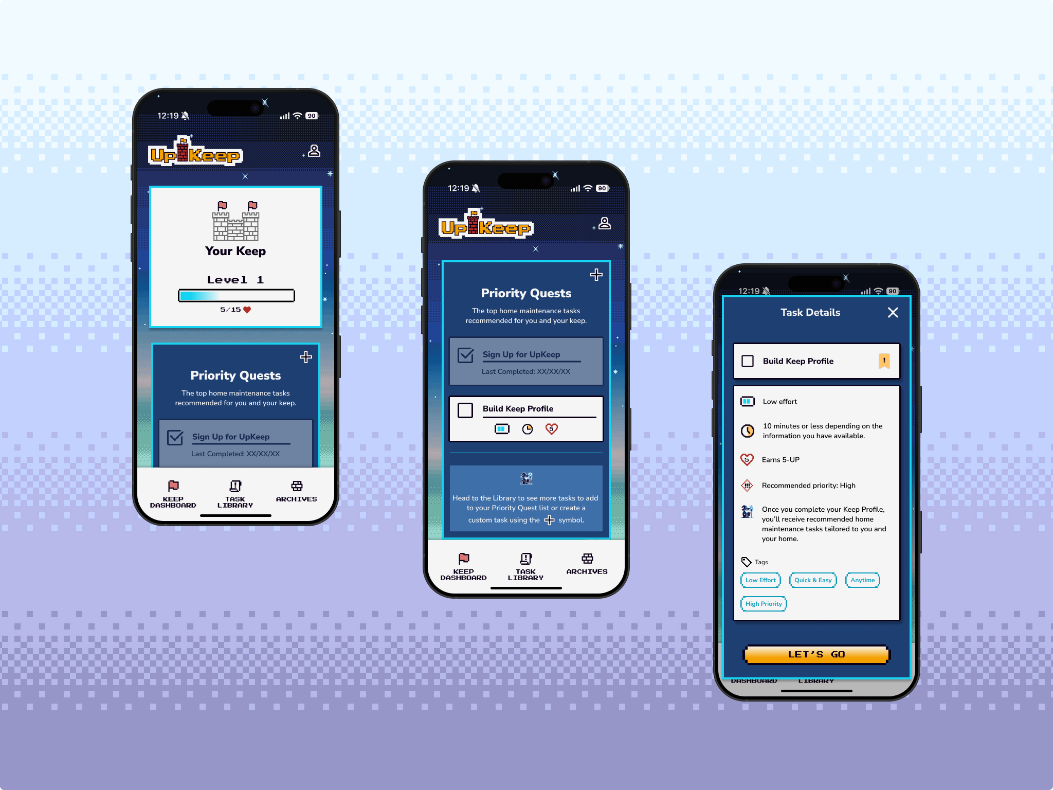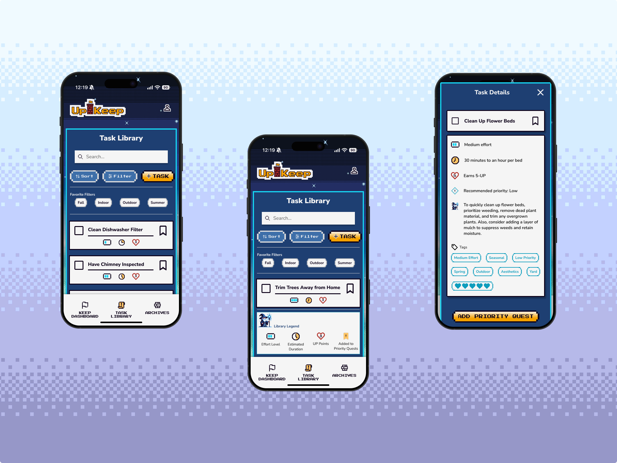 So what’s the deal with the 8-bit castle theme? Designing UpKeep wasn’t just about structure or features, it was also about storytelling. I leaned into my background in advertising and marketing—specifically my experience building brands that feel both strategic and emotionally resonant—in order to make home maintenance feel less like a dreaded chore and more like a fun, achievable quest.