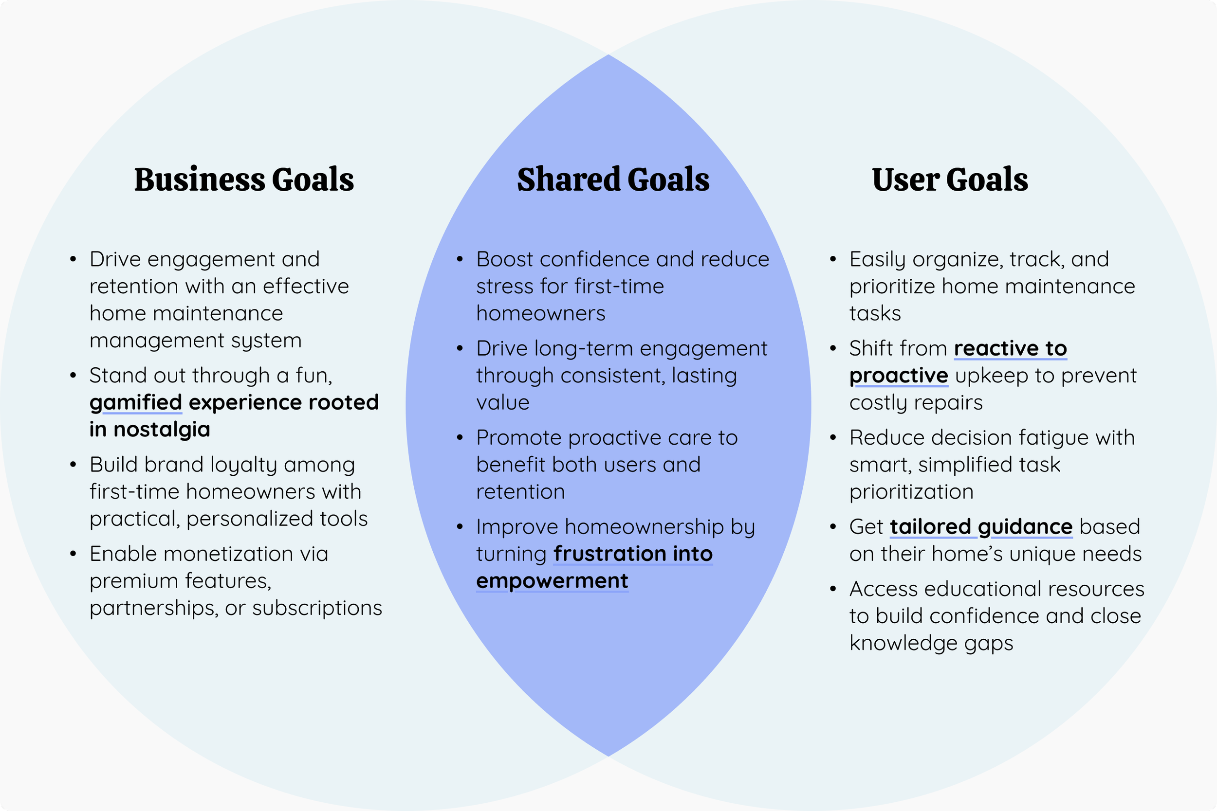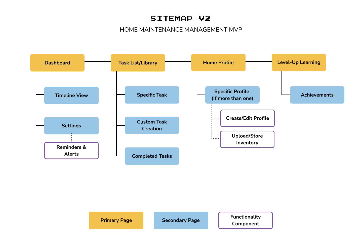 After synthesizing research insights and patterns, it became clear that what first-time homeowners need is clarity. The challenge isn’t just remembering to do tasks, but figuring out what to do, when to do it, and how to prioritize it when unexpected issues arise. My solution needed to deliver more than reminders. It needed to offer confidence, personalization, and simplicity in a sea of chaos.
