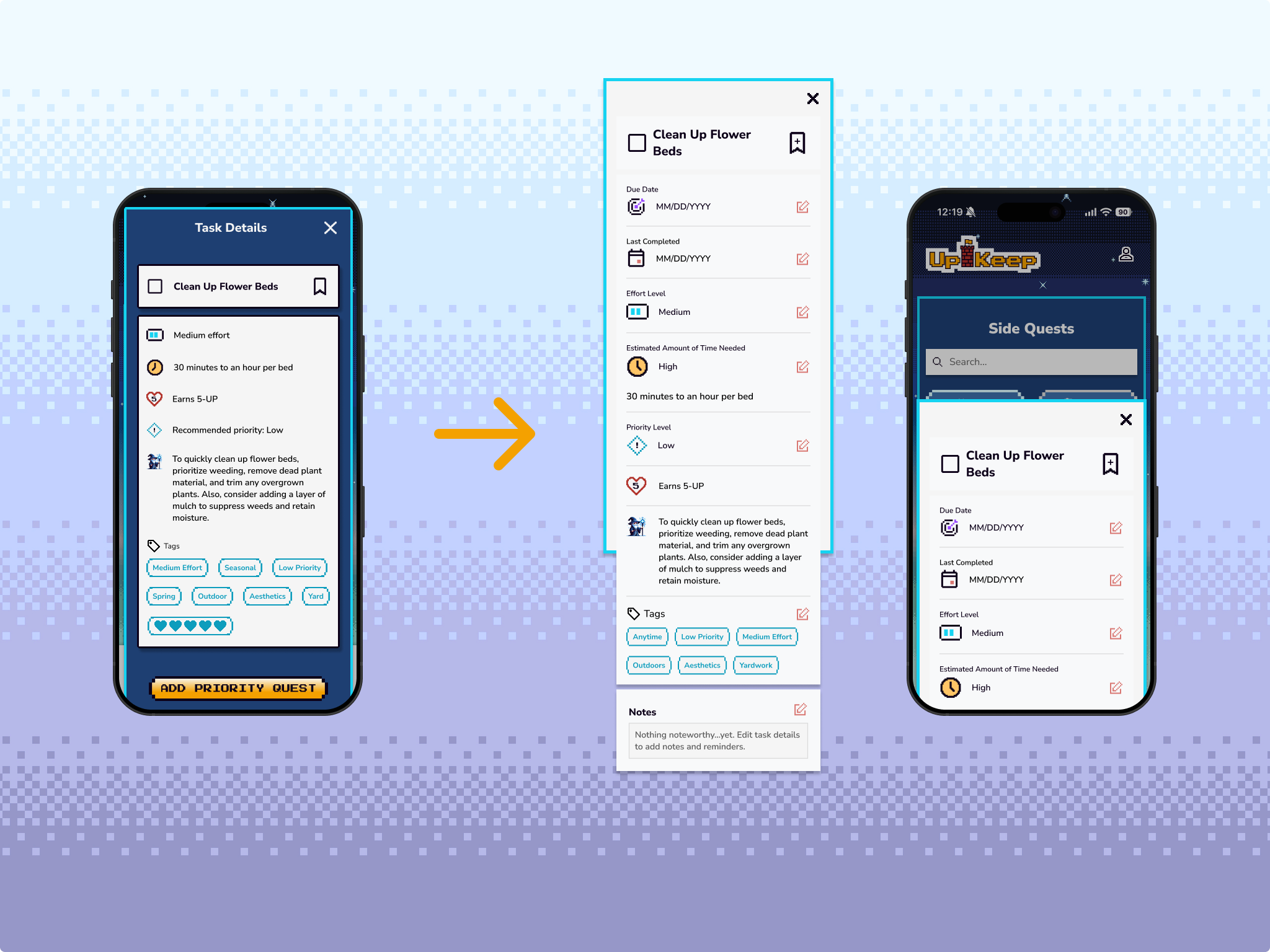 What started as a Low Effort/High Impact change quickly evolved into a High Effort/High Impact redesign. After introducing note and date inputs in the task completion overlay, I expanded the task details functionality to give users more control and customization options.