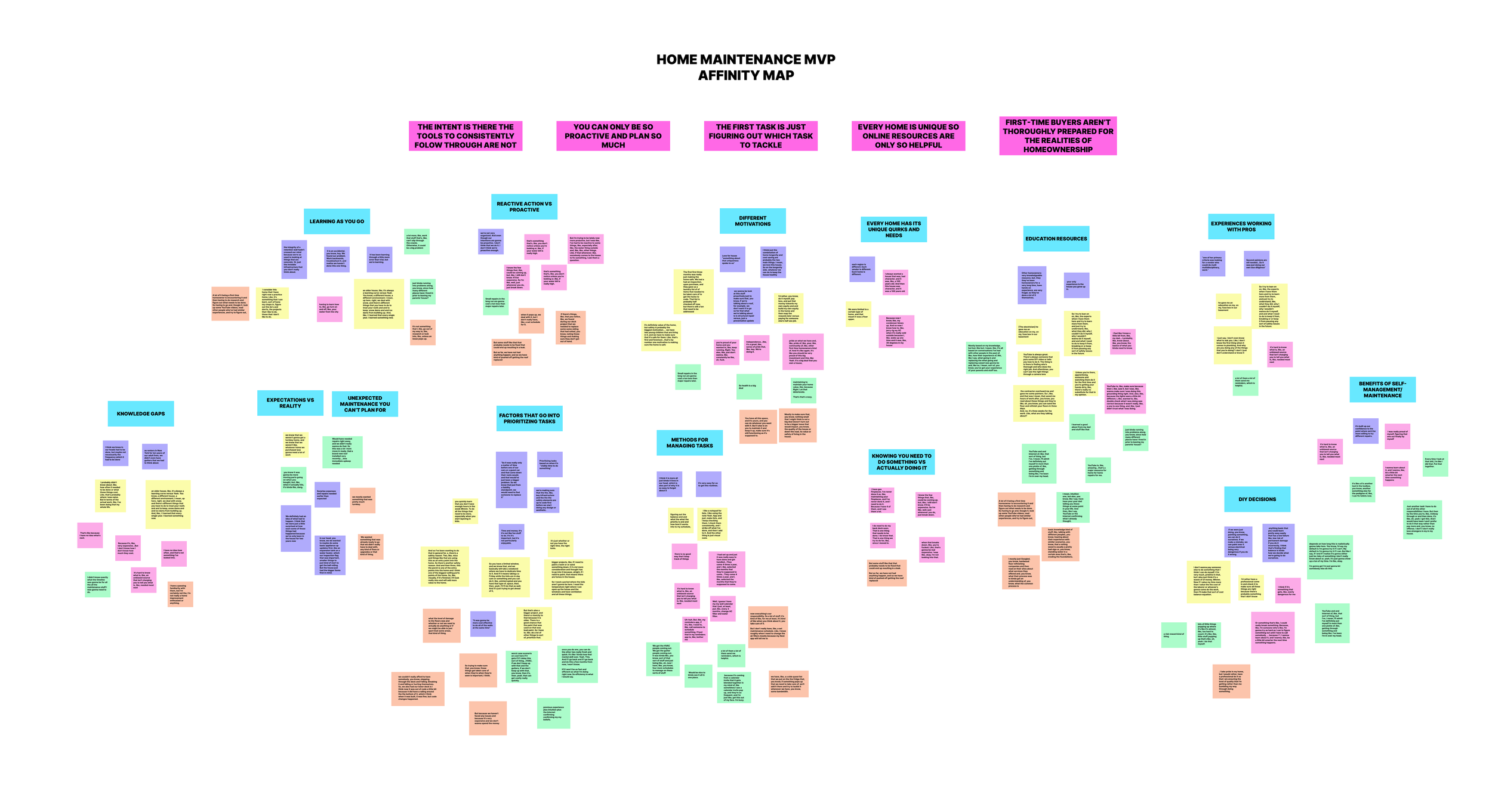 Through affinity mapping, I was able to surface common threads across interviews and uncover deeper insights about the emotional and practical realities of homeownership.